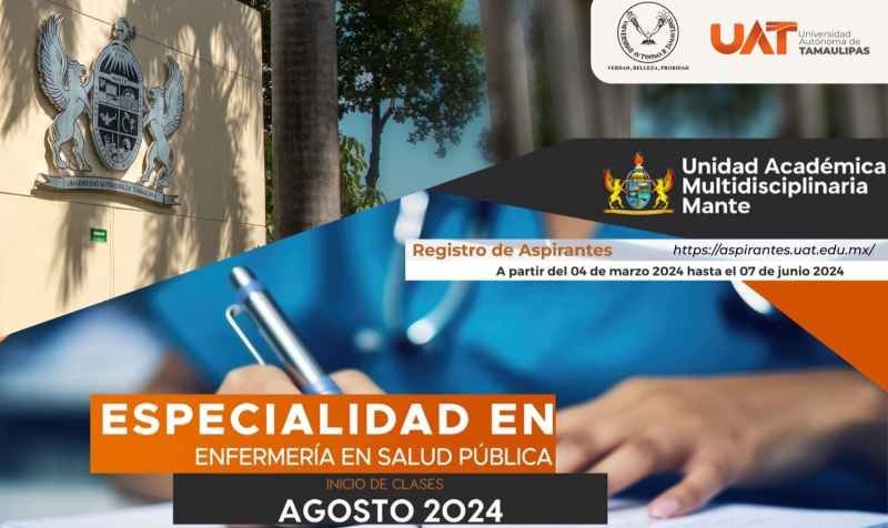 La Universidad Autónoma de Tamaulipas (UAT) mantiene disponible el registro de aspirantes a ingresar a la Especialidad en Enfermería en Salud Pública correspondiente al ciclo 2024-3, que será impartida por la Unidad Académica Multidisciplinaria Mante.