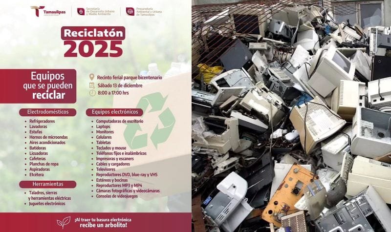 Ciudad Victoria, Tamaulipas.- Este diciembre Tamaulipas dará un paso firme hacia un entorno más sano con el Reciclatón 2025, una iniciativa que invita a la comunidad a liberar sus hogares de aparatos en desuso y, al mismo tiempo, participar en un esfuerzo colectivo que cuida la salud y la naturaleza. Con esta acción, el Gobierno del Estado impulsa una cultura responsable que transforma residuos en oportunidades para un futuro más limpio.