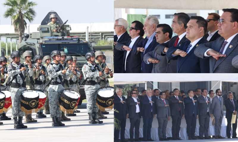 Apodaca, N.L.-El gobernador de Tamaulipas, Américo Villarreal Anaya, acudió esta mañana a la toma de posesión y protesta de bandera de los Generales de Brigada D.E.M Juan José Gómez Ruiz, comandante de la IV Región Militar (Escobedo, N.L); Fernando Colchado Gómez, comandante de la Octava Zona Militar (Reynosa) y Enrique García Jaramillo, comandante de la 48/a Zona Militar (Cd. Victoria).