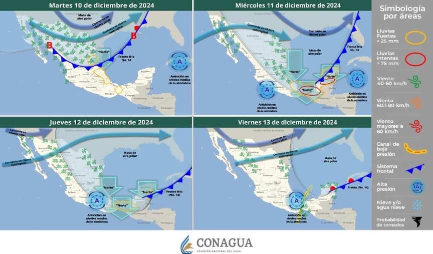 Asimismo, se pronostican vientos intensos en Baja California, Sonora, Chihuahua, Coahuila, Durango y el Istmo de Tehuantepec, con posibles tolvaneras y descensos de temperatura en las regiones afectadas.