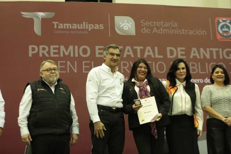 De manera especial, el gobernador entregó un reconocimiento por 55 años de servicio a Gregorio González Rodríguez, de la Oficina del Ejecutivo y a Emilio Rodríguez Montantes, del Instituto Tamaulipeco para la Cultura y las Artes, así como el reconocimiento por 50 años a Francisca Monreal García y a Benito González Delgado, ambos de la Secretaría de Finanzas.