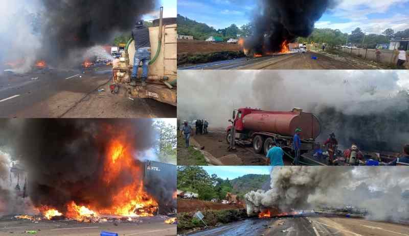 Preliminarmente, se informa que en el percance se vieron involucrados cinco tractocamiones, una camioneta de paquetería y un automóvil sedán, que resultó incendiado.