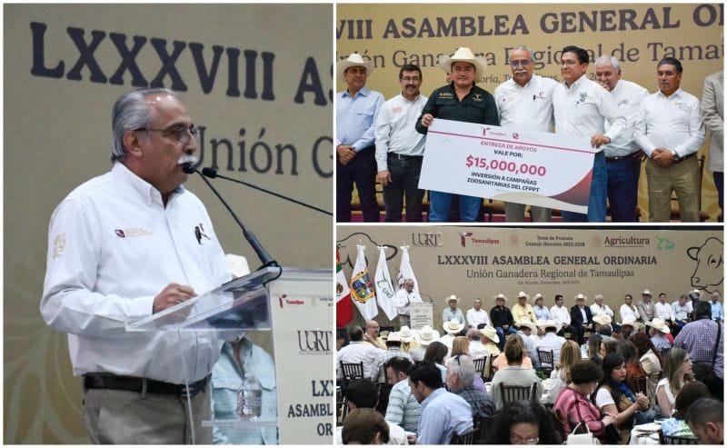 Ciudad Victoria, Tamaulipas. El secretario de Desarrollo Rural, Pesca y Acuacultura, Antonio Varela Flores, asistió en representación del gobernador Américo Villarreal Anaya a la LXXXVIII Asamblea General Ordinaria de la Unión Ganadera Regional de Tamaulipas (UGRT), evento que reunió a líderes de organizaciones ganaderas, diputados federales, presidentes municipales y productores pecuarios de todo el estado y donde informó que el gobernador Américo Villarreal Anaya ha destinado 49 MDP para el sector ganadero.