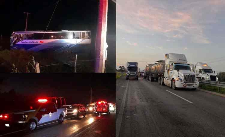 Al interior del autobús perteneciente a la empresa Omnibús de México viajaban 15 pasajeros y dos choferes, resultando lesionados estos últimos, al igual que una mujer, los tres manifestaron no requerir atención médica en un hospital.