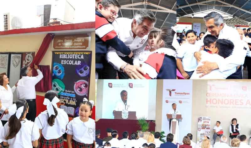 Durante el evento, también develó la placa conmemorativa de la biblioteca escolar, que a partir de este día lleva el nombre de la maestra Beatriz Anaya de Villarreal, quien laboró durante muchos años en esa escuela. El gobernador agradeció a la directora, Martha Lucio Torres, por este gesto y reconoció su labor de más de 47 años en la formación de nuevas generaciones de tamaulipecas y tamaulipecos.