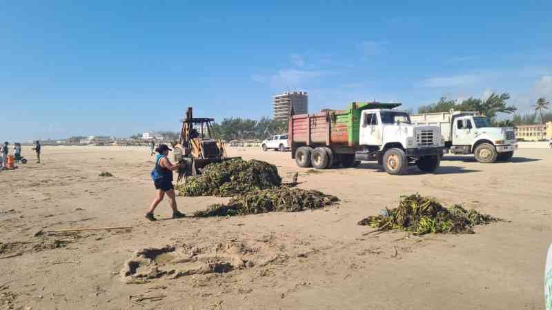 Ciudad Madero, Tamaulipas.- Para contrarrestar la presencia del lirio acuático en la playa Miramar de Ciudad Madero, la Secretaría de Turismo de Tamaulipas dispuso de cuatro camiones y dos retroexcavadoras para la limpieza del lugar.