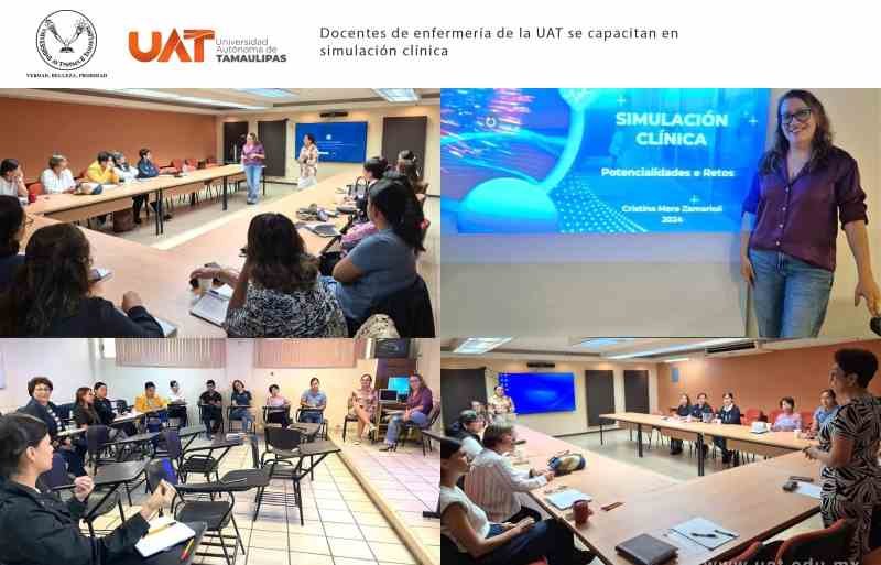 Docentes de la Facultad de Enfermería Tampico de la Universidad Autónoma de Tamaulipas (UAT) se capacitan a través de un curso titulado “Simulación clínica, potencialidades y retos”, que se lleva a cabo en ese plantel universitario del Campus Sur.