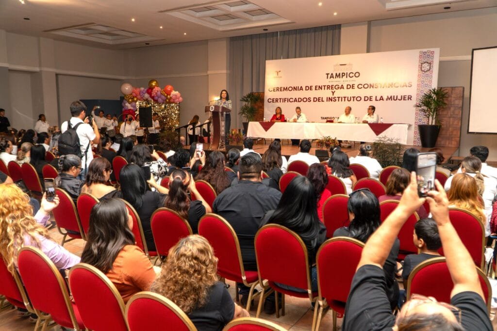 La Presidenta Municipal de Tampico, Mónica Villarreal Anaya, encabezó la ceremonia de entrega de constancias y certificados a las más de 400 participantes de los cursos y talleres que fueron impartidos en los módulos del Instituto de la Mujer.