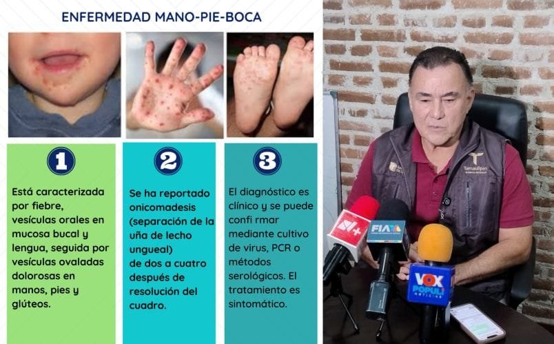 Por instrucciones del secretario de Salud, Vicente Joel Hernández Navarro, se da seguimiento puntual a la evolución de la enfermedad boca-mano-pie en el estado, y seguirá aplicando las medidas preventivas correspondientes para proteger la salud de la población tamaulipeca.
