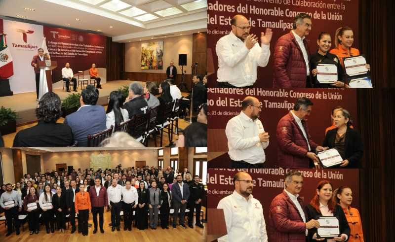 Al señalar que es prioridad para su gobierno que las y los servidores públicos se capaciten de manera continua, el gobernador de Tamaulipas, Américo Villarreal Anaya, hizo entrega de 59 reconocimientos a personal de diferentes secretarías que concluyeron cursos de capacitación derivados del Convenio de Colaboración entre la Cámara de Senadores del Congreso de la Unión y el Gobierno de Tamaulipas.