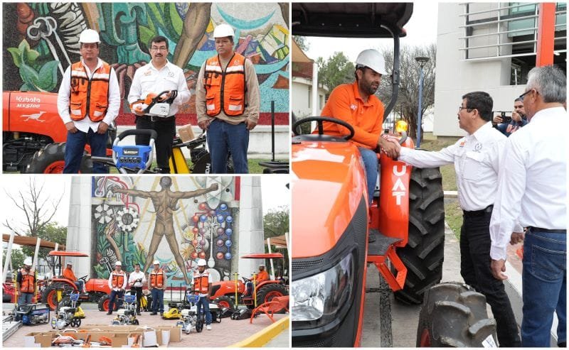En la ceremonia realizada en el Centro Universitario Victoria, se dotó de nuevo equipo y herramientas consistentes en hidrolavadoras, escaleras, motosierras, compactadoras, cortadoras de piso, tractores, generadores eléctricos y gatos hidráulicos, entre otras.