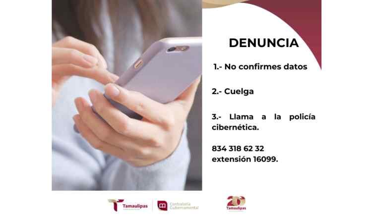 Ante ello, se recomienda evitar confirmar datos, no corregir información y colgar. El extorsionador siempre tendrá tiempo para volver a marcar. Si lo vuelve a hacer, obtenga de él la mayor información posible y denuncie a la policía cibernética al 834 318 62 32, extensión 16099.