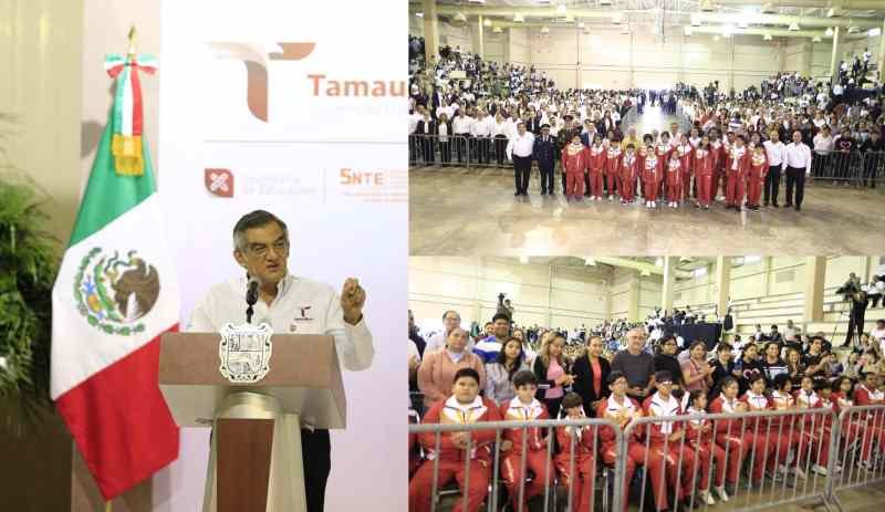 Ante el personal docente, padres de familia y la estructura del sector educativo del estado, y luego de la bienvenida a cargo de Esteban Carrizales Martínez, director de la Secundaria General No. 4, el mandatario hizo un reconocimiento a la delegación de 20 estudiantes, desde 1º de primaria hasta media superior, que representó a Tamaulipas en la Olimpiada Nacional de Matemáticas, en la que ocho alumnos lograron medallas de oro, plata y bronce.