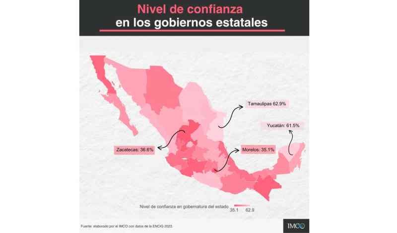 Tamaulipas se ubica por encima del gobierno de Yucatán, que suma un 61.5 por ciento de nivel de confianza, seguido por Coahuila con 58.5 por ciento, Guerrero con 58.3 por ciento y Aguascalientes con 57.6 por ciento.