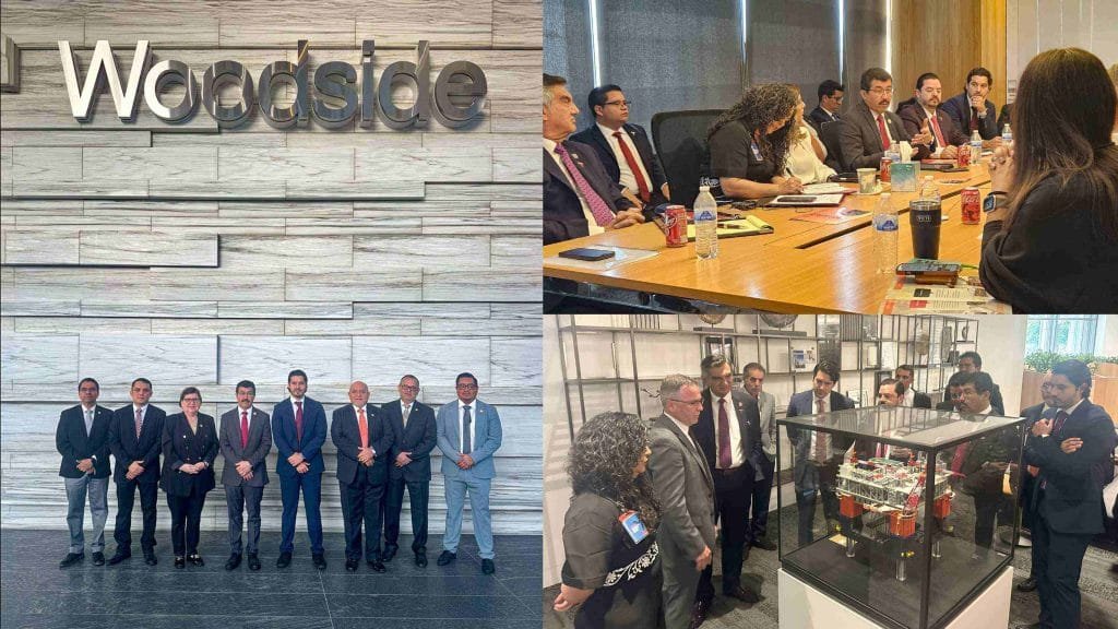 Los directivos de Woodside Energy Daniel Kalms, vicepresidente ejecutivo y jefe de la Oficina de Operaciones Internacionales, y Stephen Drouaud, vicepresidente del proyecto TRION, dieron la bienvenida a la comitiva tamaulipeca encabezada por el doctor Américo Villarreal.