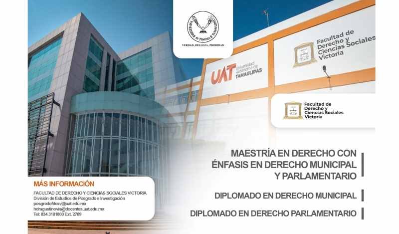 La Universidad Autónoma de Tamaulipas (UAT) abrirá el programa de Maestría en Derecho con Énfasis en Derecho Municipal y Parlamentario, junto con dos programas de diplomados especializados en estas mismas áreas.