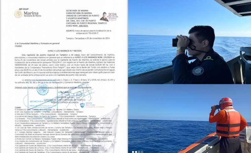 La Capitanía de Puerto Regional en Tampico hizo del conocimiento de marinos, pescadores y comunidad marítima sobre el apoyo para la localización de la embarcación pesquera «FELGON II», con registro en el Puerto de Altamira, número de matrícula 28050934438, de 24 pies de eslora, casco color banco, con un motor fuera de borda SUZUKI 60 hp. con 2 tripulantes de la Cooperativa «Pescadores Finos Felgón”.