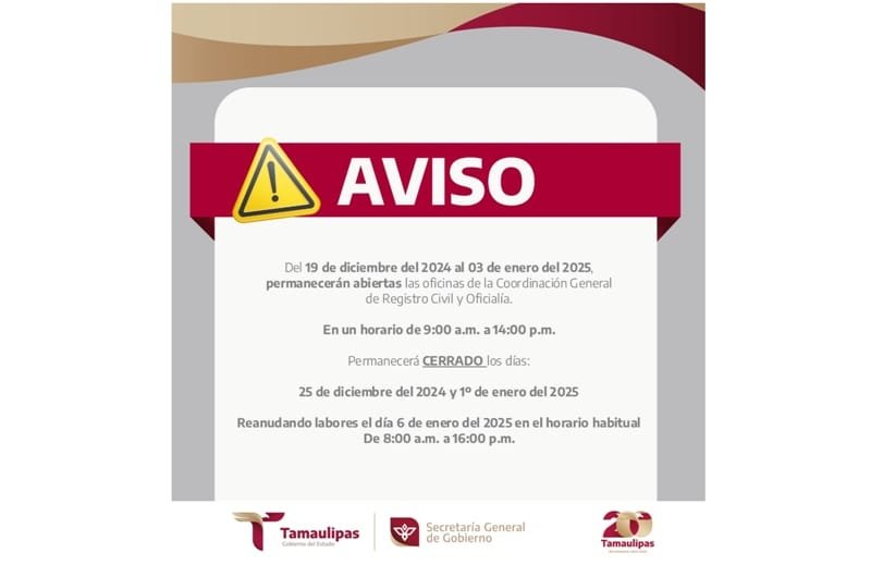 Ciudad Victoria, Tamaulipas.- El coordinador del Registro Civil, Mauro Francisco Sandoval Contreras, informó que en cumplimiento con el compromiso de atención a la ciudadanía, la Coordinación de Registro Civil continuará brindando sus servicios durante el periodo de receso comprendido del 19 de diciembre al 3 de enero de 2025.