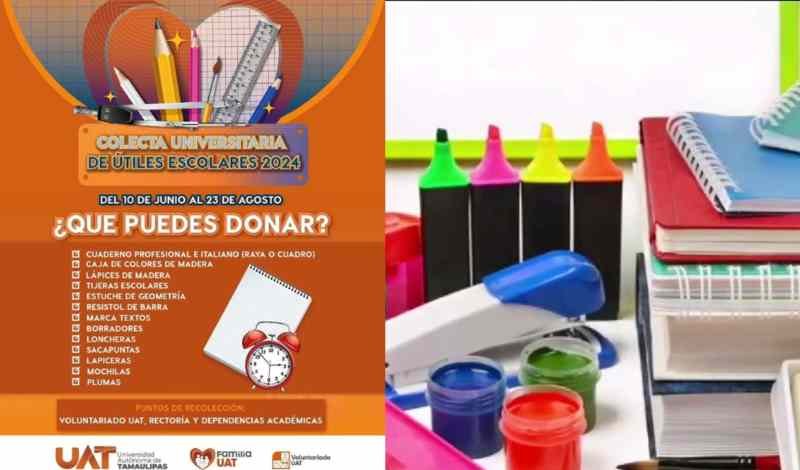 Bajo la dirección de la presidenta del voluntariado Familia UAT, Lic. Isolda Rendón de Anaya, la Universidad ha organizado esta colecta que se llevará a cabo del 10 de junio al 23 de agosto, en la que invita a sus docentes, estudiantes, personal de administración y servicios, así como a toda la sociedad en general a donar útiles escolares nuevos y en buen estado.