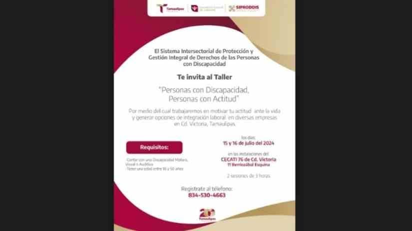 Este taller, dirigido a personas mayores de edad con discapacidad, tiene como objetivo fomentar una actitud positiva ante la vida y brindar herramientas para su integración laboral efectiva. Se llevará a cabo los días 15 y 16 de julio, en las instalaciones del CECATI 76, ubicado en la calle 11 Berriozábal, en Ciudad Victoria.