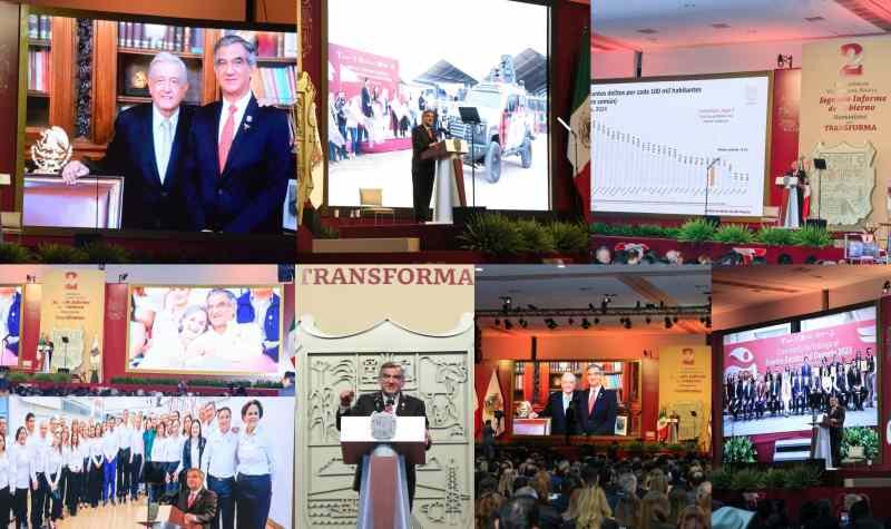 Ante la presencia de la presidenta del DIF, Tamaulipas, María de Villarreal y titulares de los Poderes Legislativo y Judicial, integrantes del gabinete federal, legisladores, mandos militares y de las fuerzas armadas, dirigentes de organismos industriales, cámaras empresariales y representantes de todos los sectores productivos, el mandatario tamaulipeco señaló que el segundo informe entregado este día al Honorable Congreso de Tamaulipas sobre el estado que guarda la administración pública, describe de manera detallada las 857 acciones realizadas, atendiendo a los marcos estratégicos de la planeación democrática y aterrizan en los objetivos de los tres grandes ejes del Plan Estatal de Desarrollo: Gobierno al Servicio del Pueblo, Desarrollo Inclusivo y Sostenible y Política Social para el Bienestar.