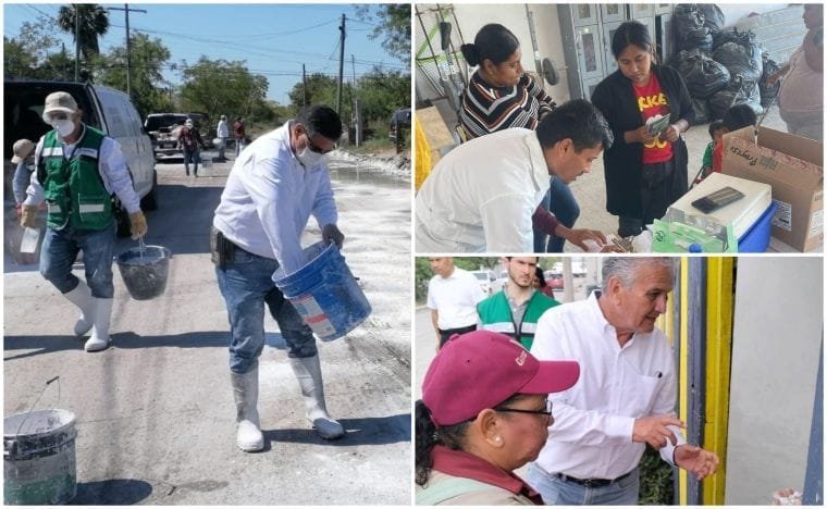 Entre los trabajos realizados y que se llevan a cabo desde el inicio de la contingencia, destaca el monitoreo de cloración de los depósitos de agua, determinación de cloro residual libre en red de agua potable, encalamiento en los focos infecciosos, se realiza la entrega de kits sanitarios, se mantiene la descacharrización, fumigación y eliminación de objetos para evitar la reproducción del mosco transmisor del dengue, aunado a las atenciones médicas y vigilancia epidemiológica para evitar y descartar brotes de enfermedades.