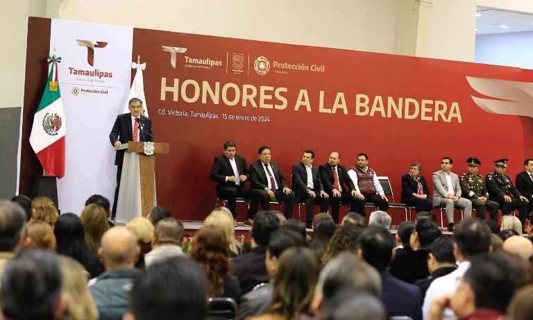 Ciudad Victoria, Tamaulipas.- En el marco de la ceremonia cívica de honores de este lunes, organizada por la Coordinación Estatal de Protección Civil, el gobernador Américo Villarreal Anaya hizo un llamado para estar atentos a la advertencia meteorológica por el descenso de la temperatura y pidió reforzar las medidas de prevención a fin de lograr, en la medida de lo posible, que se puedan mitigar los daños.